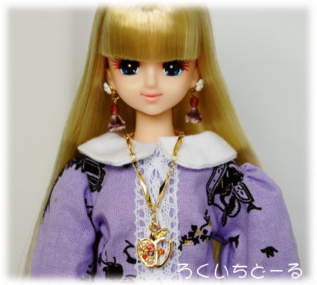 イヤリングの飾りは花の形で、ドレスと同じ紫色です。チャームはもちろんリンゴ。