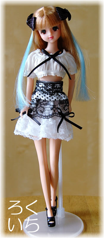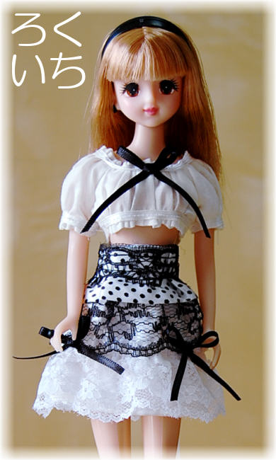 スカートは白サテンのシンプルなギャザースカート。仕上げ寸法はウエスト11センチ、すそ18センチ、ベルト込みの総長さ7センチです。レースを巻き込むのでウエスト寸法を少々大き目にしています。